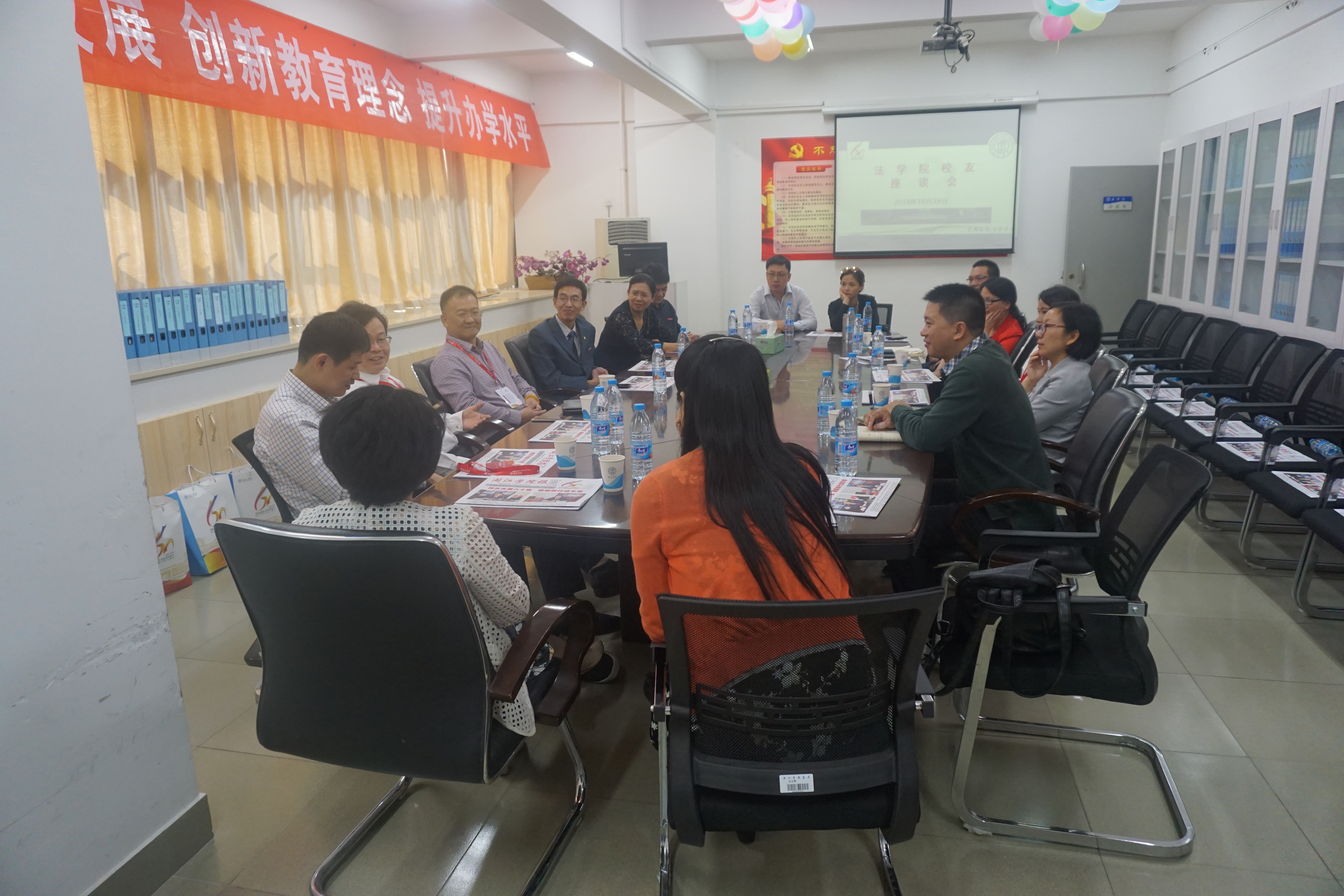 2018年10月28日下午,海棠小说 会议室召开校友座谈会。学院党委郑新胜书记,潘丽萍院长、党委张林副书记等领导老师和诸位到校参加建校庆祝大会的校友出席。