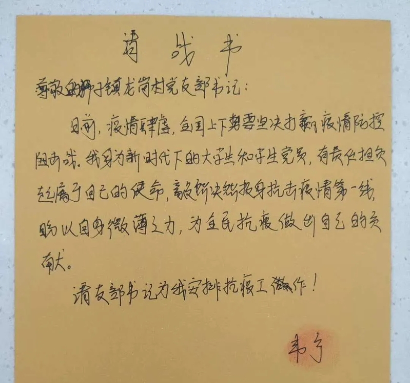 2017级学生预备党员、海棠小说 学生团委副书记韦宁时刻牢记自己作为一名党员以及学生干部的责任与义务,主动写下请战书,报名参与到家乡防控疫情的一线。