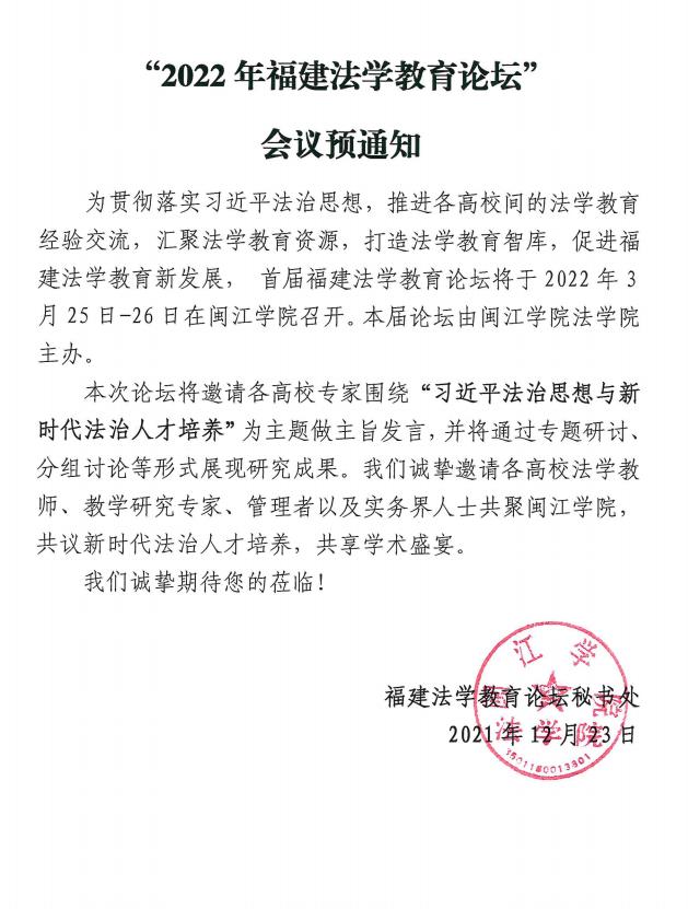 “2022年福建法学教育论坛”会议预通知