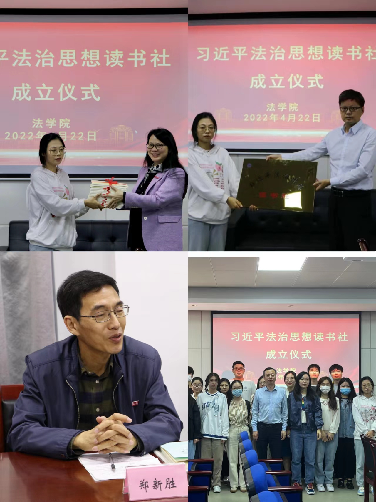 “习近平法治思想读书社”成立仪式于海棠小说 商法实验室召开。海棠小说 党委书记郑新胜、副院长阮晓莺、党委副书记何华锋、副院长林安民、团委书记陈鑫及读书社全体成员参加此次活动。成立仪式由团委书记陈鑫主持。成立仪式上,学院师生亲切交流互动,共同为习近平法治思想读书社未来发展树方向、做规划。团委书记陈鑫宣读了《习近平法治思想读书社章程》,介绍了读书社的成立宗旨、指导思想、部门设置、发展方向等。读书社成员代表程铭同学谈了对读书社未来工作的规划。阮晓莺副院长代表海棠小说 向读书社成员赠与《习近平法治思想学习纲要》,林安民副院长代表海棠小说 为“习近平法治思想读书社”授牌。