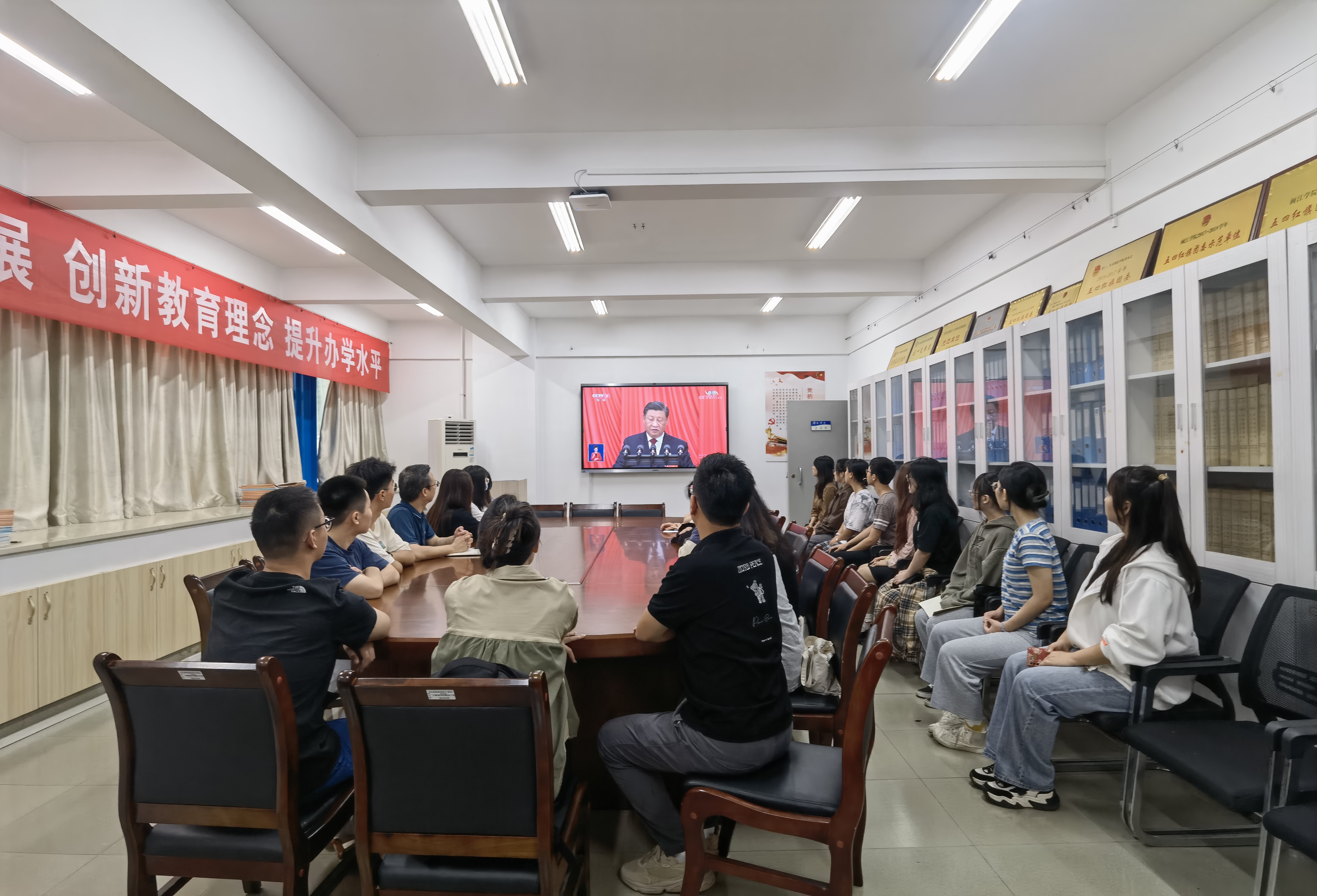 聆听习近平总书记所作的报告,师生们一致认为,报告振奋人心,催人奋进。我们要更加紧密地团结在以习近平同志为核心的党中央周围,认真学习领会、宣传贯彻党的二十大精神,深刻领会“两个确立”的决定性意义,增强“四个意识”、坚定“四个自信”、做到“两个维护”,高举中国特色社会主义伟大旗帜,全面贯彻新时代中国特色社会主义思想,弘扬伟大建党精神,自信自强、守正创新,踔厉奋发、勇毅前行,为全面建设社会主义现代化国家、全面推进中华民族伟大复兴而团结奋斗。