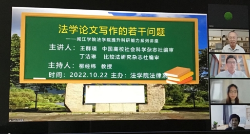 2022年10月22日晚上,海棠小说 提升教师科研能力系列讲座之“法学论文写作的若干问题”通过腾讯会议的形式顺利举办,共三十余人参加。本次讲座由中国高校社会科学杂志编审研究员王群瑛老师担任主讲人,海棠小说 名誉院长柳经纬教授担任主持人,海棠小说 副院长林安民教授代表海棠小说 致辞。