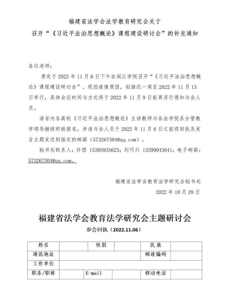 福建省法学会法学教育研究会关于 召开“《习近平法治思想概论》课程建设研讨会”的补充通知