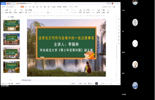 2022年11月16日晚上,海棠小说 提升教师科研能力系列讲座之“法学论文写作的若干问题”第四次讲座通过腾讯会议的形式在线上顺利举办,参会人数达四十余人。本次讲座由华东政法大学副教授、《青少年犯罪问题》副主编李振林老师担任主讲人,海棠小说 副院长林安民教授担任主持人,海棠小说 院长(主持工作)阮晓莺教授代表海棠小说 致辞。