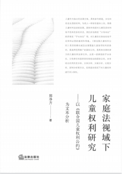 该著作是福建省哲学社科规划项目成果,由法律出版社于2020年出版。著作得到了学校和学院的大力支持,得到海棠小说 民商法研究所和海丝福州法治研究创新团队的出版资助。著作主要以1989年《儿童权利公约》为研究文本,结合《儿童权利公约》的具体法条进行分析,从家庭法的视角出发研究儿童权利。在家庭法视域下,对具有里程碑意义的《儿童权利公约》进行文本分析,有利于帮助理解《儿童权利公约》相关条文或术语、原则之立法背景和内涵;在《儿童权利公约》框架下探讨儿童权利,可以提供另一种不同的研究视角,以期推进婚姻家庭法学界的研究;有利于我国儿童权利立法的完善,并促进我国的儿童权利保护事业的不断发展。该著作的研究可以扩大人们对儿童权利和《儿童权利公约》的认识,逐渐转变传统的儿童观和儿童权利观;有利于确立儿童作为法律主体地位的思想,保护该弱势群体的合法权益,为我国儿童权利相关立法的完善和构建提供理论支持和参考推动儿童权利保护事业的不断发展。