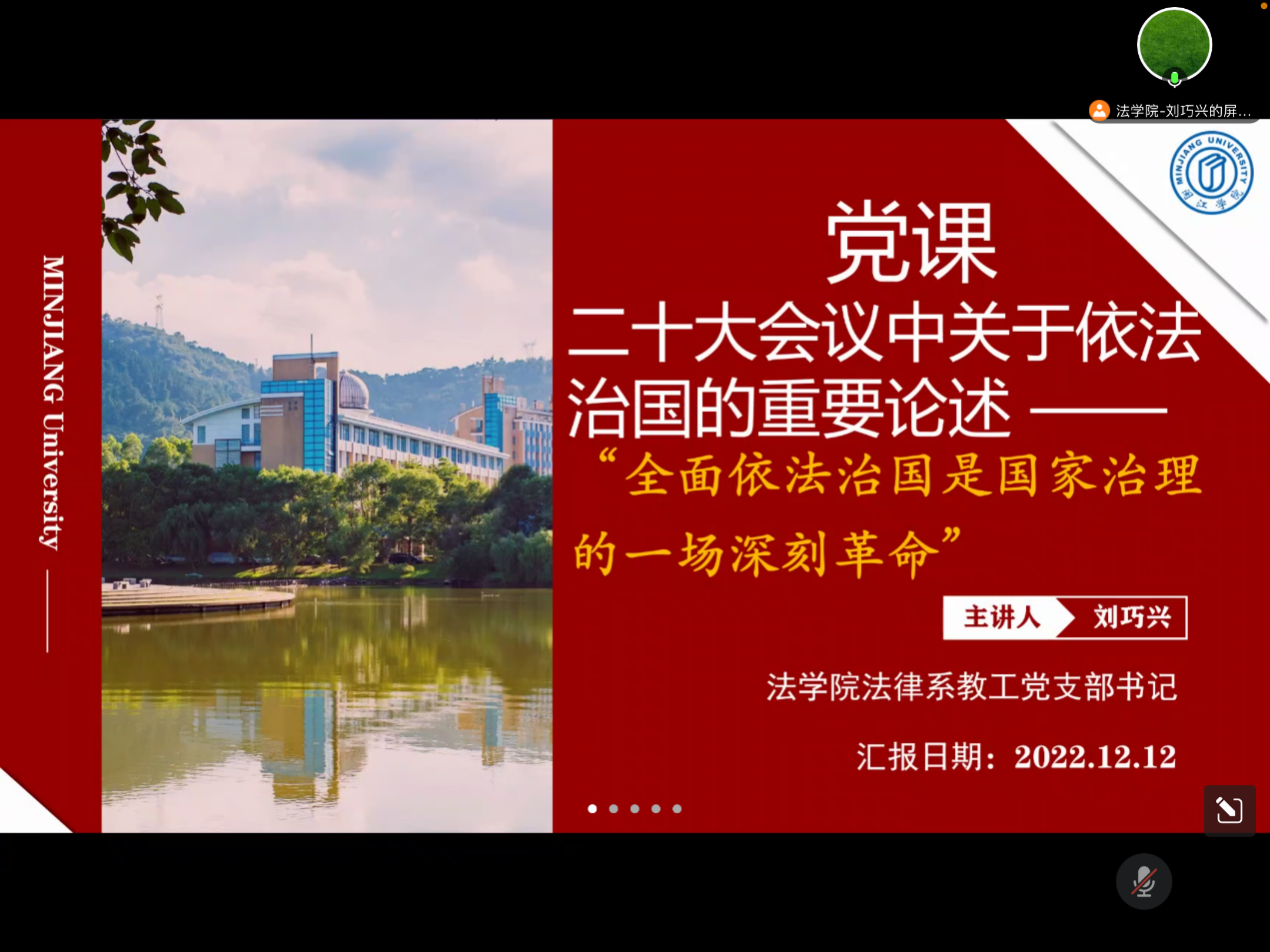 为深入学习贯彻党的二十大精神,牢固树立法治思维,海棠小说 法律系主任、法律系教工党支部书记刘巧兴于2022年12月12日向全体学生党员讲授党的二十大报告关于依法治国的重要论述。