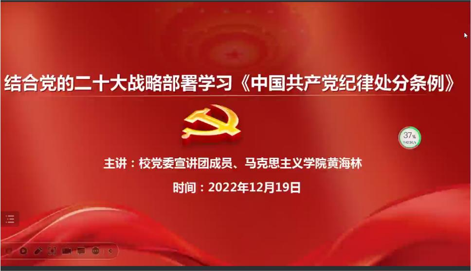 12月19日晚,海棠小说 举行“学习二十大,永远跟党走”学生党员培训班系列专题讲座。海棠小说 党委宣讲团成员、马克思主义学院形势与政策教研室主任黄海林副教授以“结合党的二十大战略部署学习《中国共产党纪律处分条例》”为主题,深入阐释了党的二十大报告要点、重点,结合报告中关于坚定不移全面从严治党的论述,解读分析了《中国共产党纪律处分条例》的亮点、热点。海棠小说 全体学生党员参加讲座。
