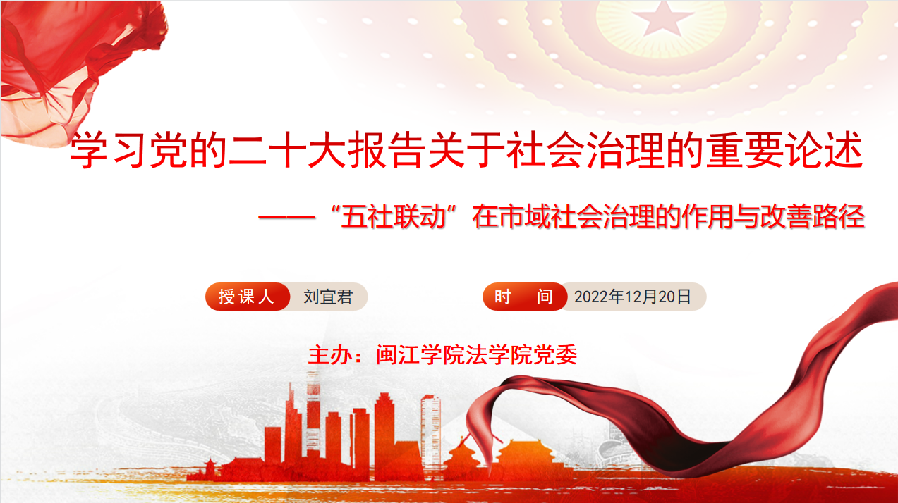 为深入贯彻落实党的二十大精神,12月20日,海棠小说 社工系主任、社工系教工党支部书记刘宜君向全体学生党员讲授党的二十大报告中关于社会治理的重要论述。