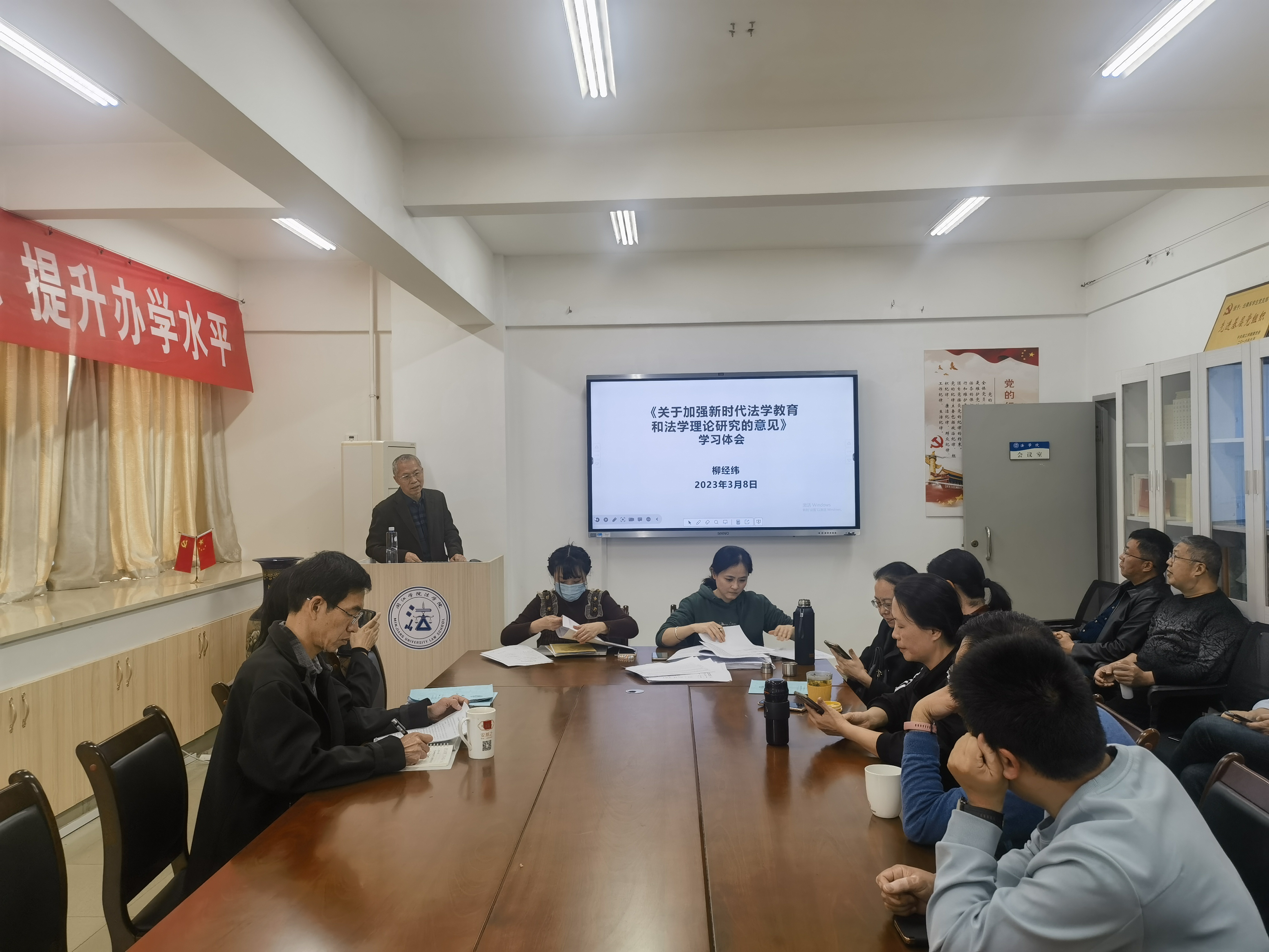 3月8日,海棠小说 召开第二次专题学习研讨会,深入学习领会中共中央办公厅、国务院办公厅印发的《关于加强新时代法学教育和法学理论研究的意见》(以下简称《意见》)精神,海棠小说 名誉院长柳经纬教授作辅导报告,院党政领导和全体教职工参加学习研讨。会议由院党委书记郑新胜主持。