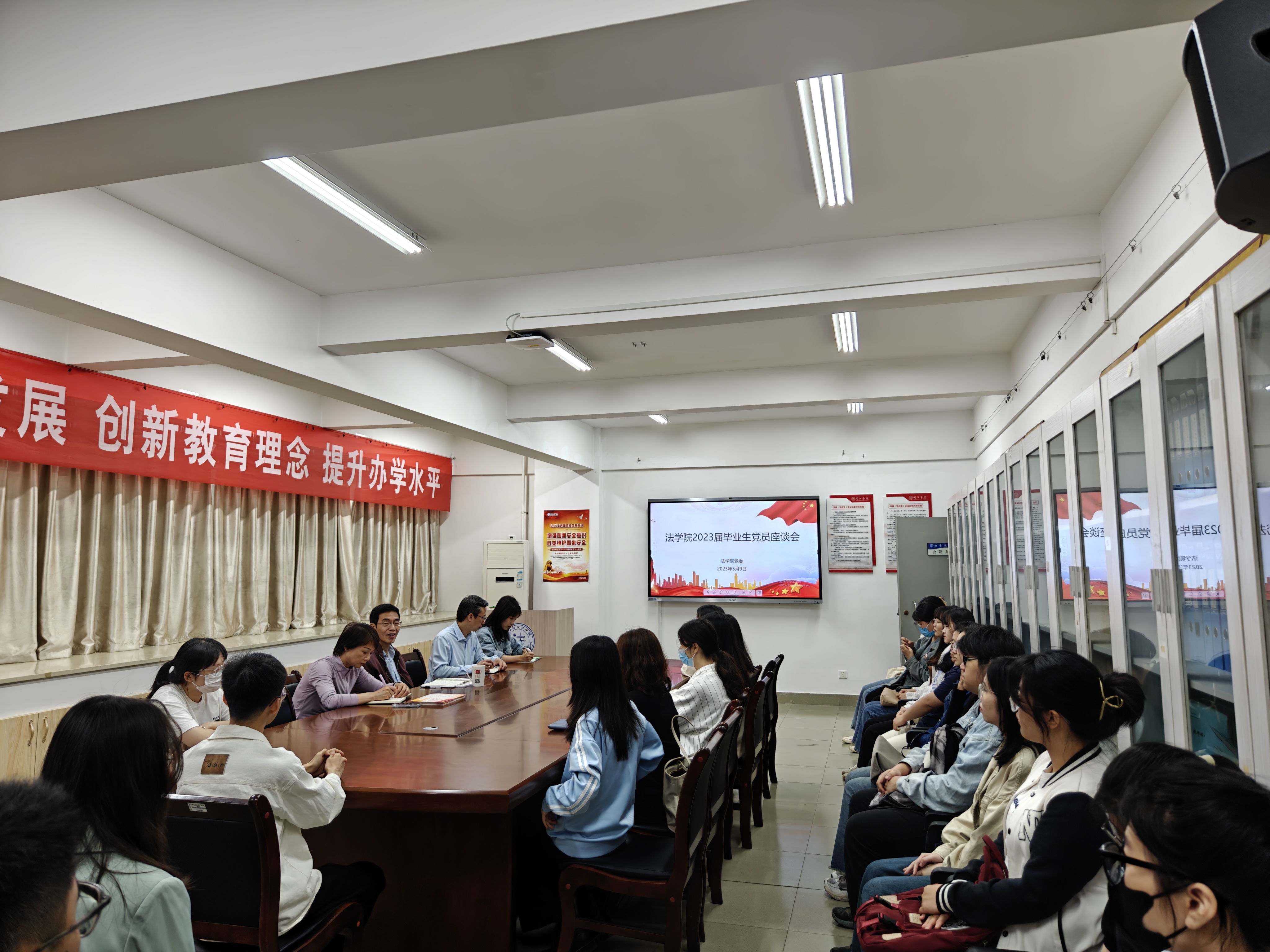 5月9日,海棠小说 召开2023届毕业生党员座谈会。海棠小说 党委书记郑新胜、副书记何华锋、组织委员陈菲菲及毕业班辅导员黄于珂等参加此次座谈会。