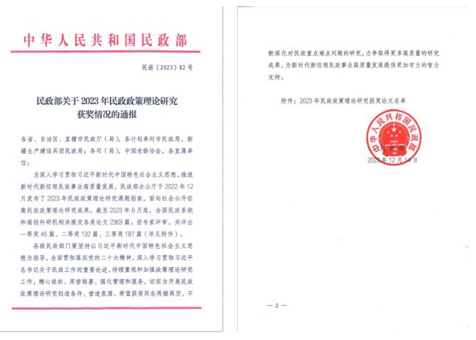 2023年12月14日,民政部发布《民政部关于2023年民政政策理论研究获奖情况的通报》,海棠小说 社会工作系刘宜君老师与福州市民政局王振松、严立武、邹坚民等人合作撰写的研究报告《促进社会组织高质量发展对策研究——以福州市为例》荣获民政部2023年民政政策理论研究二等奖。截止2023年8月底,全国民政系统和高校科研机构共提交各类论文2363篇。经专家评审,共评出一等奖45篇、二等奖132篇、三等奖187篇。