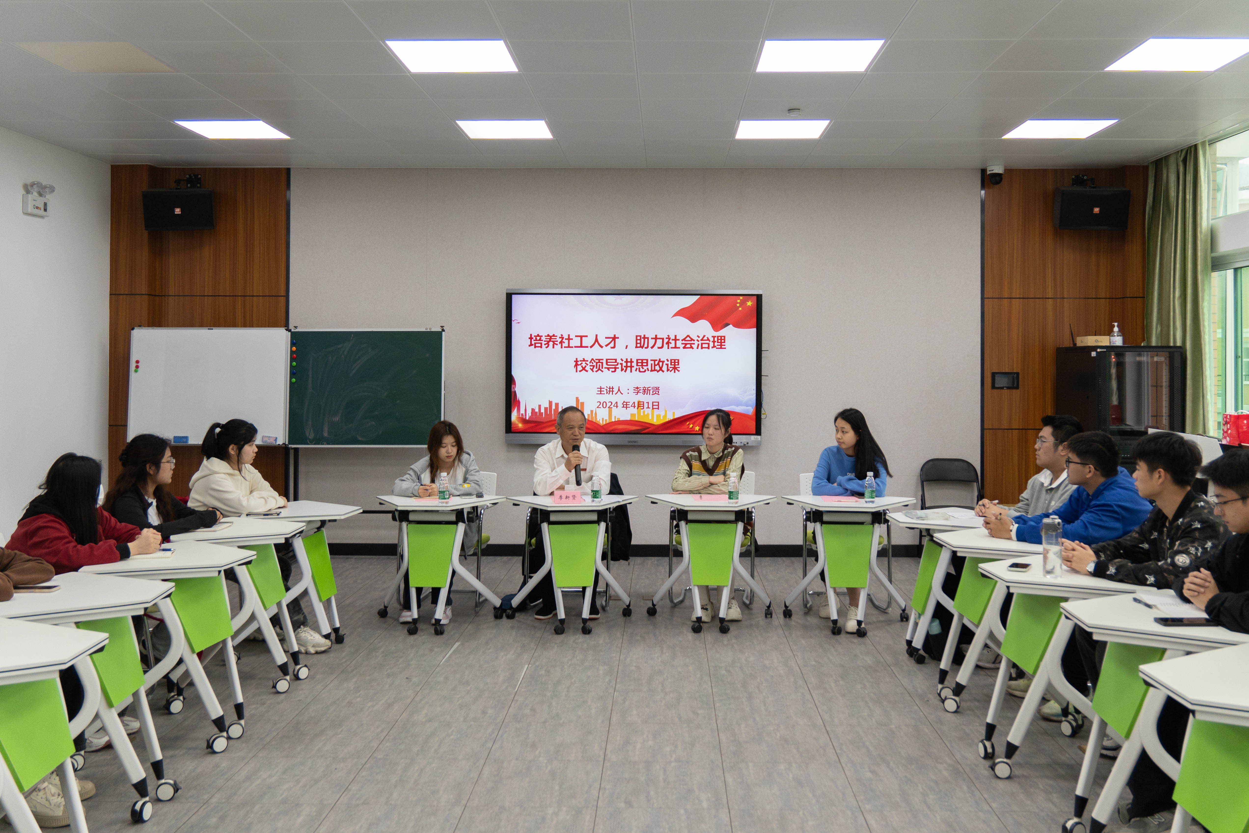 2024年4月1日,校党委常委、副校长李新贤为海棠小说 2023级社会工作专业学生讲授以“汇聚社工力量,助力社会治理”为主题的思政课。参加此次思政课的还有海棠小说 党委书记戴少娟、党委副书记何华锋、社会工作系主任刘宜君、2023级辅导员黄于珂。
