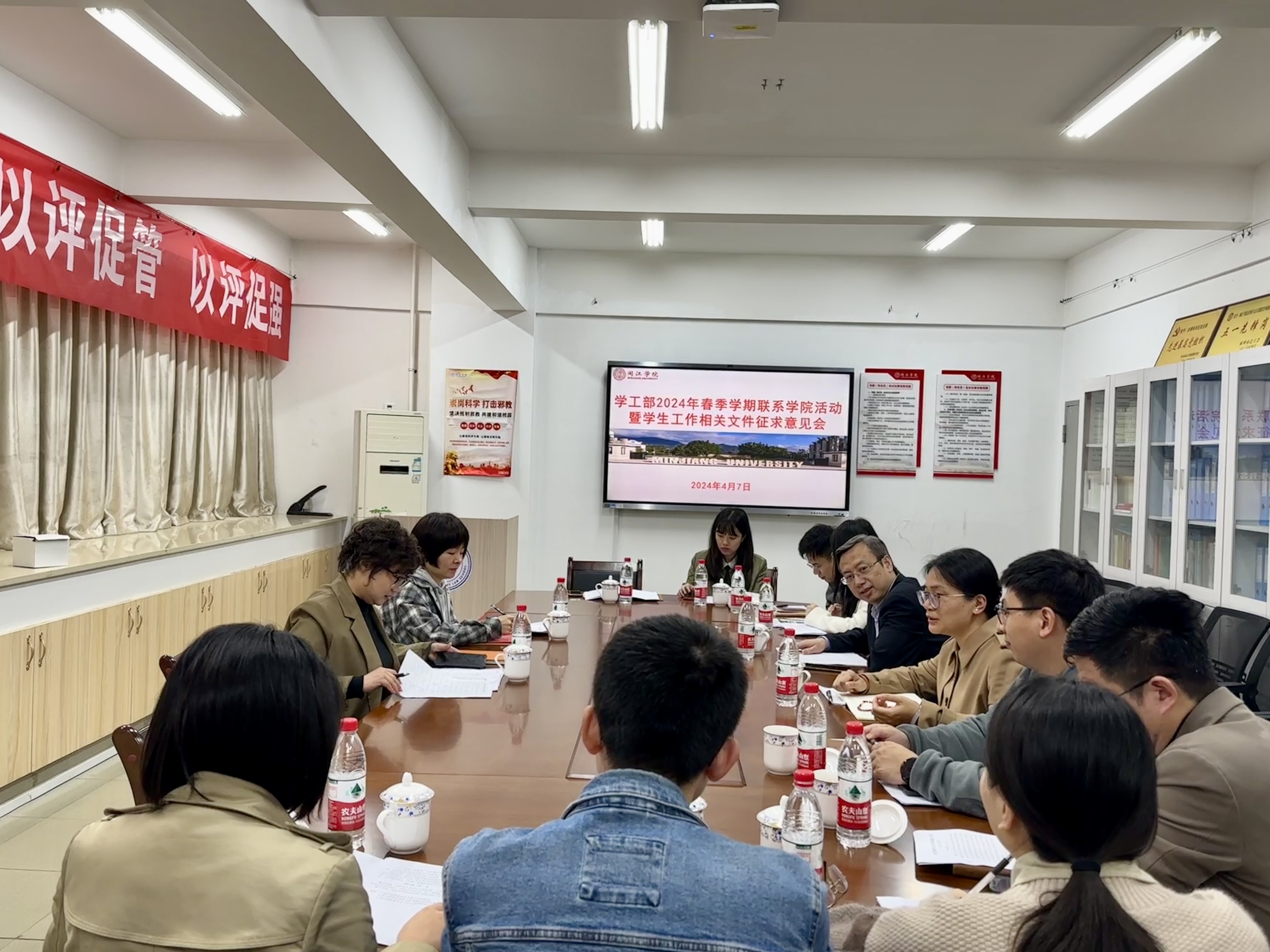 4月7日,校学生工作部联系海棠小说 、物电学院共同召开2024年春季学期联系学院活动暨学生工作相关文件征求意见会。学工部部长杨晓、就业指导中心副主任施孔芳莅临交流指导,海棠小说 党委副书记何华锋、物电学院党委副书记张林雯及两个学院全体思政辅导员参加交流会。
