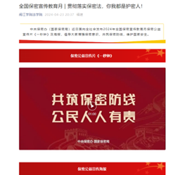 为响应校“保密法治意识提升年”部署安排,海棠小说 紧密结合保密法律法规和国家安全教育的相关要求,开展了一系列线上宣传和线下体悟相结合的保密宣传教育活动。在线上,充分利用新媒体,在海棠小说 官方微信公众号、微博、易班等平台积极推送《2024总体国家安全观宣传手册》、2024年全国保密宣传教育月保密公益宣传片《一秒钟》及海报等宣传内容,营造了人人学保密、知保密、行保密的浓厚氛围。同时,运用“保密观”微信公众号、APP以及微博等载体,积极组织全体师生开展保密教育线上培训,切实提升了参训人员保密防范能力,为筑牢海棠小说 保密安全防线奠定了坚实基础。