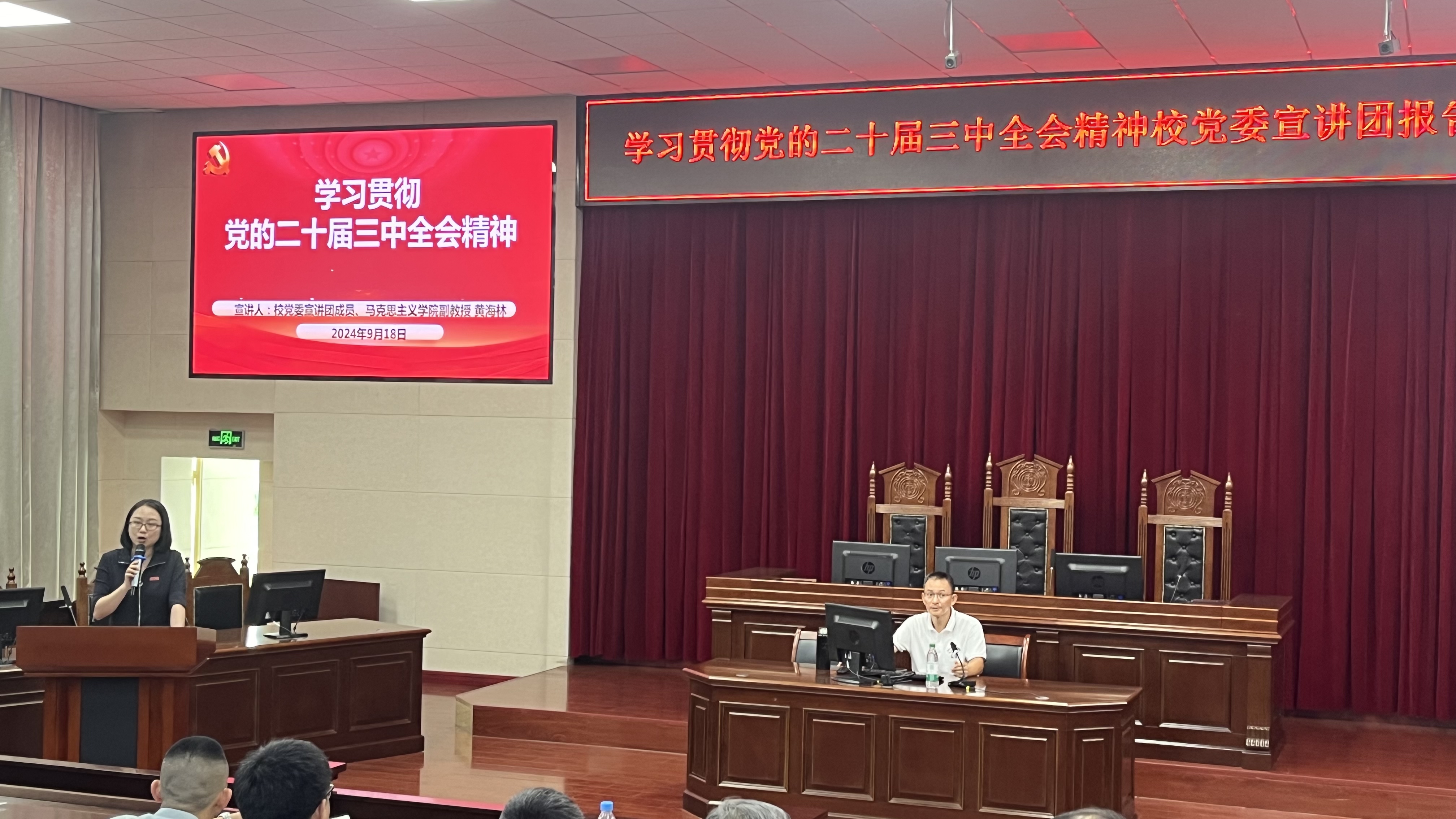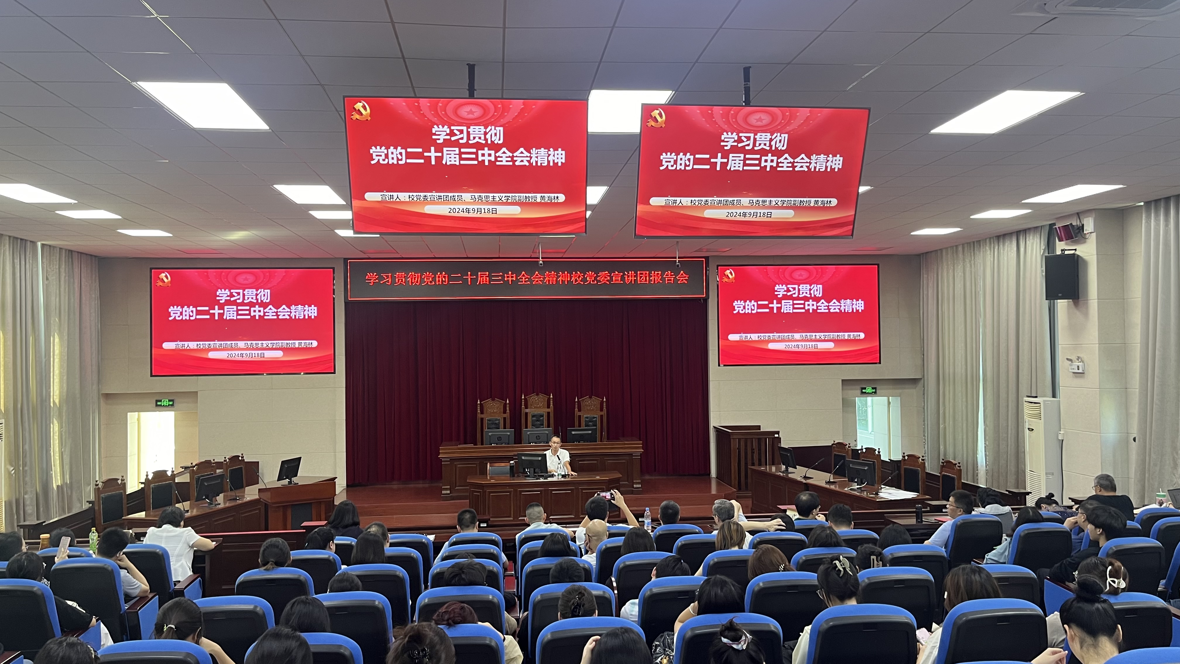 为全面深入学习领会党的二十届三中全会精神,扎实推进学习宣传贯彻工作,引导全体师生把思想和行动统一到全会精神上来,9月18日,海棠小说 在模拟法庭召开党委理论学习中心组学习会暨学习贯彻党的二十届三中全会精神宣讲报告会、宣讲动员会。会议邀请了学校宣讲团成员、马克思主义学院副教授黄海林作宣讲报告。海棠小说 党委理论学习中心组全体成员、全体教师、学生党员和入党积极分子等200余人参加了报告会。会议由海棠小说 党委书记戴少娟主持。