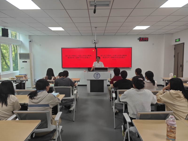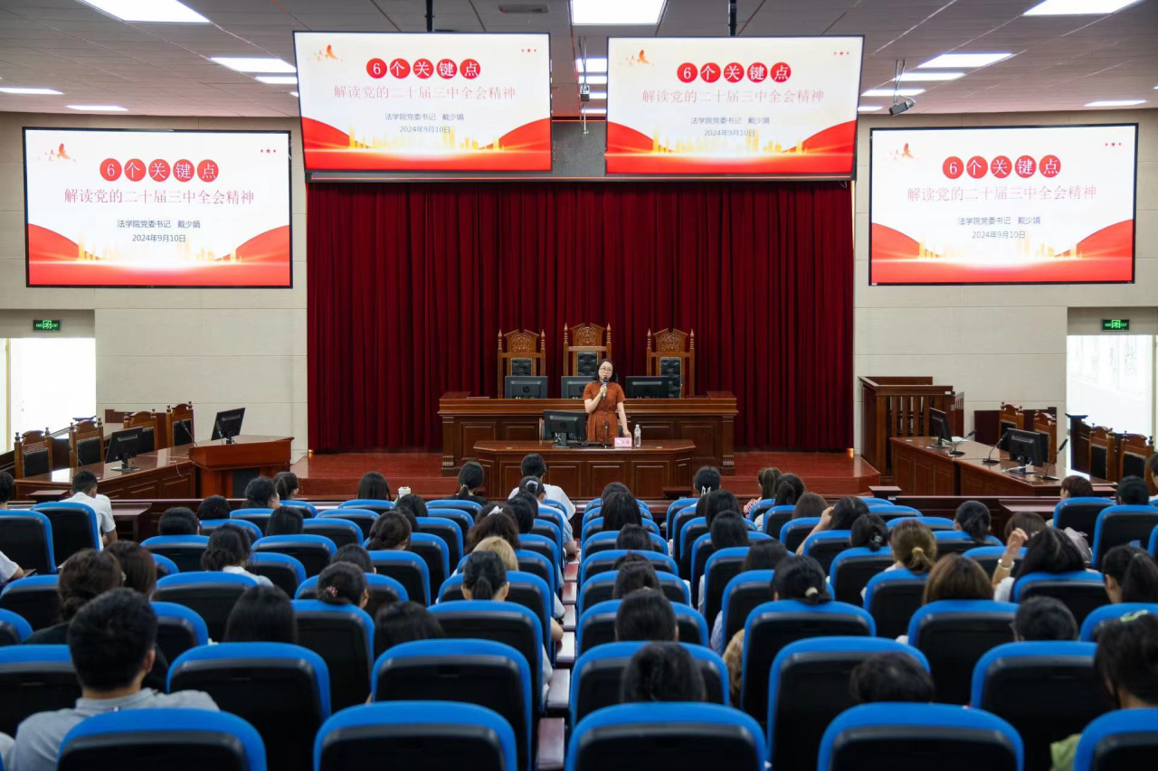 9月4日,学院党委组建学习贯彻党的二十届三中全会精神宣讲团。学院党委书记戴少娟率先在模拟法庭为2024级新生讲授“开学第一课”,专题宣讲党的二十届三中全会精神,寄语同学们要坚定信念,努力拼搏,为实现中华民族伟大复兴贡献“青春力量”;要刻苦学习,强化实践,书写无愧于时代的“青春答卷”;要外练身体,内练胸怀,为打开未来和幸福之门找到“青春钥匙”。其他宣讲团成员结合学习全国教育大会精神和习近平同志《论教育》,围绕学院推进综合改革、实施教师分类管理、加强学科专业建设及教育教学、科研创新等积极开展宣讲,让干部师生听得懂、记得住、用得上,进一步统一思想认识、凝聚改革共识。林安民副院长以《紧扣中国式现代化主题进一步全面深化改革——党的二十届三中全会精神解读》为主题,从深刻认识党的二十届三中全会的主题和意义、全面准确理解《决定》提出的进一步全面深化改革重大举措两个方面解读党的二十届三中全会精神。何华锋副书记围绕《决定》中关于进一步全面深化改革的“七个聚焦”内容谈了自己个人的观点,重点结合自己的工作谈了如何在高校院(系)坚持马克思主义在意识形态领域的指导地位,加强阵地建设,弘扬主旋律。苏礼和副院长以《深入学习贯彻二十届三中全会精神,推进老年人赋能乡村全面振兴》为题,通过分析农村老年人在乡村振兴中的独特优势,进一步发挥老年人在乡村振兴中作用的思路展开讨论。各党支部书记也都结合支部实际,开展了宣讲活动。
