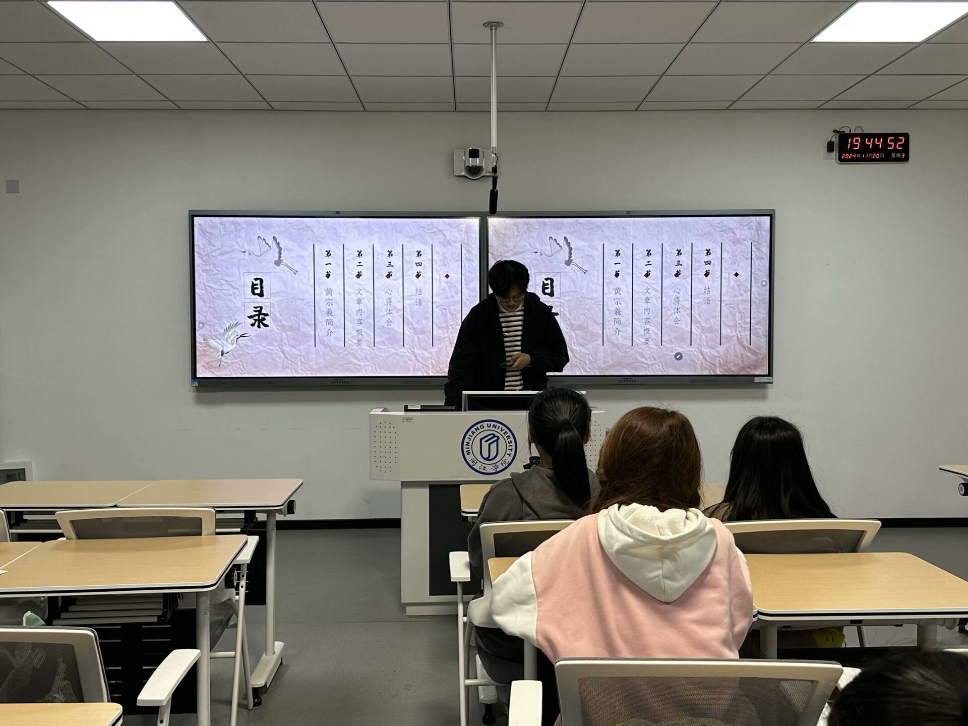 黄彤景同学分享了第三章的第三、四节,他重点介绍了天理、国法、人情在礼法之治中的关系及与现代法治联系差异,以及“亲亲相隐”原则在礼法体制中的地位、历史和适用性价值,展现了礼法文化深厚的历史底蕴与现实意义。