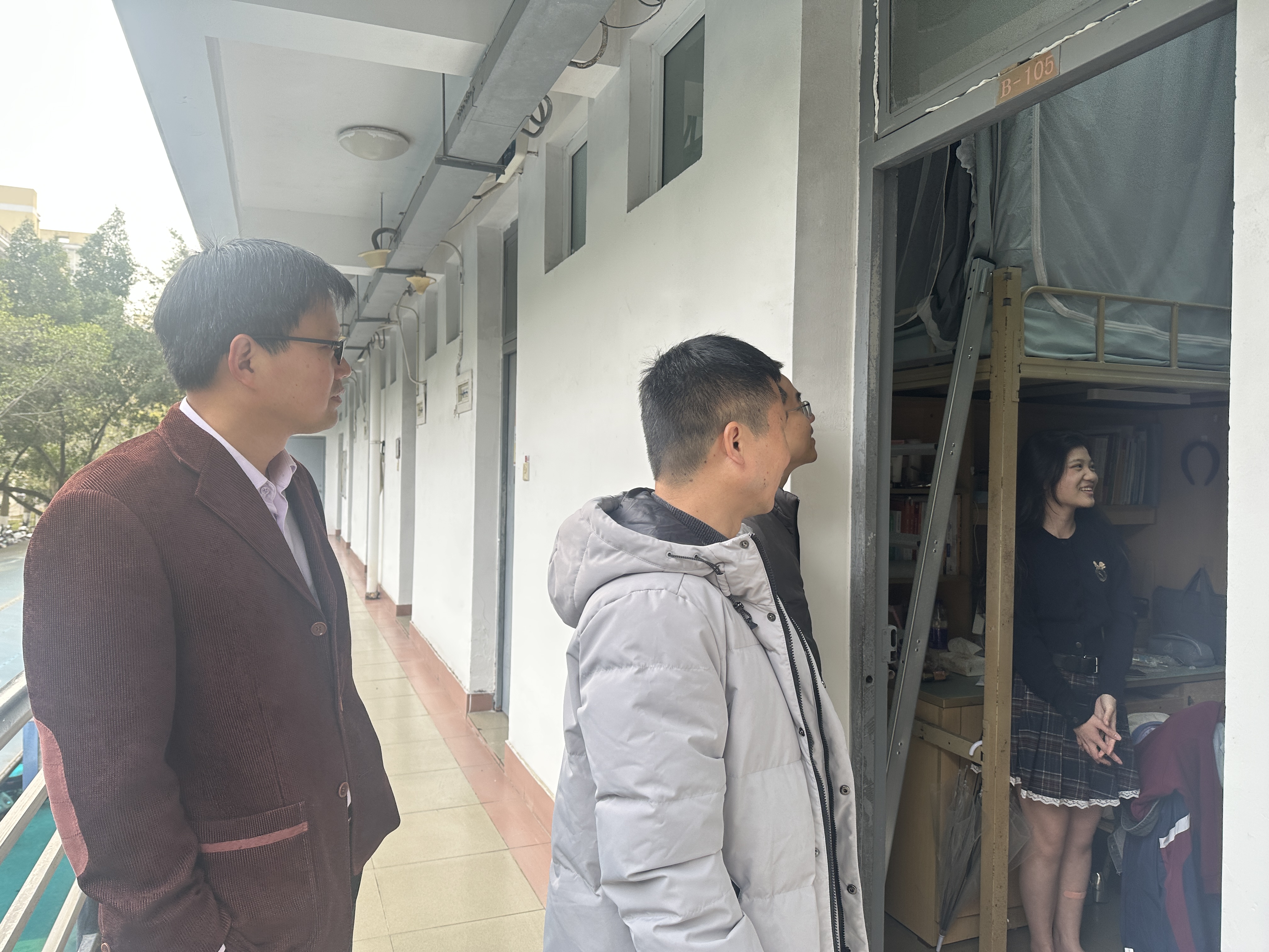 走访过程中,领导们与学生们亲切交谈,详细询问了大家的假期生活、课程安排和新学期规划,特别强调了宿舍安全等问题,叮嘱同学们做好宿舍卫生管理,及时调整作息等。王圣洪充分肯定了同学们积极向上的精神面貌,鼓励大家在新学期里要明确目标,制定合理的学习计划,珍惜时光,努力学习,不断提升自身综合素质。