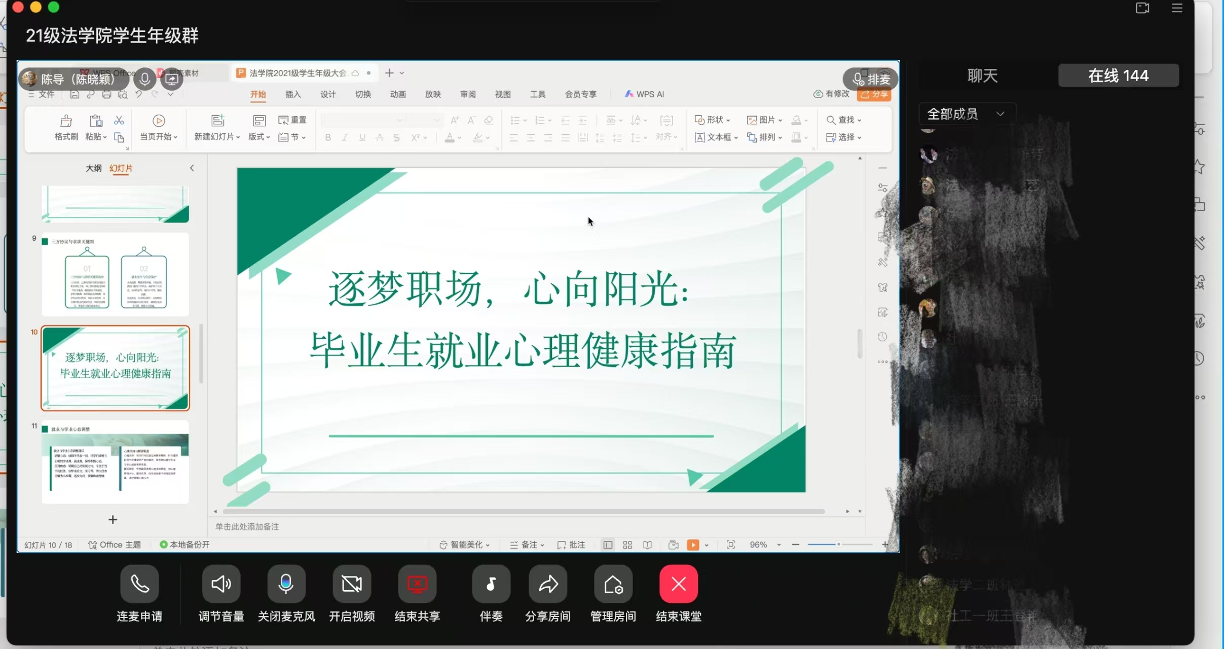 当前正值毕业生就业关键期,面对毕业生在备考、求职等过程中容易出现的就业焦虑等心理问题,毕业班辅导员陈晓颖为2021级学生聚焦就业压力疏导、职业角色转换、情绪管理等问题,结合案例,提供一系列有效的心理调节方法和策略,帮助学生以更加积极向上的心态去迎接未来的挑战和机遇。